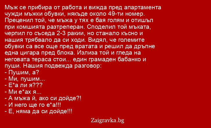 Мъж се прибира от работа и вижда пред апартамента чужди мъжки обувки, някъде около 49-ти номер. Преценил той, че мъжа у тях е бая голям и отишъл при комшията разтреперан. Споделил той мъката, черпил го съседа 2-3 ракии, но станало късно и нашия трябвало да си ходи. Видял, че големите обувки са все още пред вратата и решил да дръпне една цигара пред блока. Излиза той и гледа на неговата тераса стои... един грамаден бабанко и пуши. Нашия подвежда разговор: