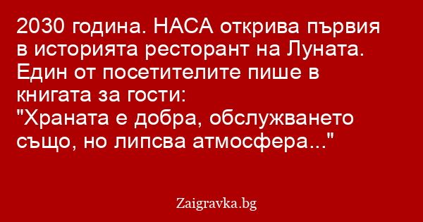 2030 година. НАСА открива първия в историята ресторант на Луната. Един от посетителите пише в книгата за гости: