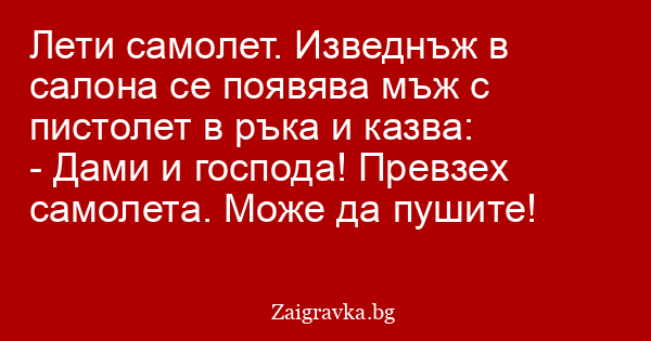 Лети самолет. Изведнъж в салона се появява мъж с пистолет в ръка и казва: