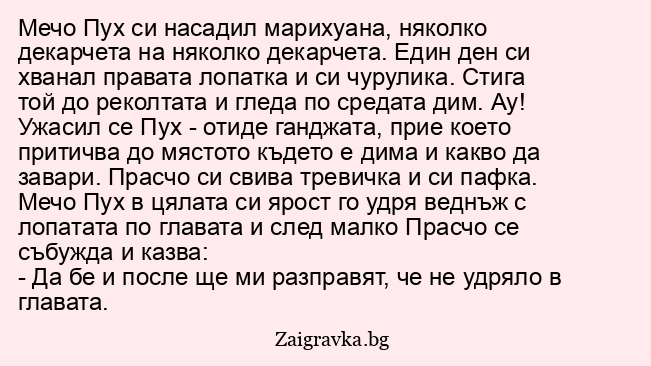Мечо Пух си насадил марихуана, няколко декарчета на няколко декарчета. Един ден си хванал правата лопатка и си чурулика. Стига той до реколтата и гледа по средата дим. Ау! Ужасил се Пух - отиде ганджата, прие което притичва до мястото където е дима и какво да завари. Прасчо си свива тревичка и си пафка. Мечо Пух в цялата си ярост го удря веднъж с лопатата по главата и след малко Прасчо се събужда и казва: