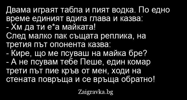 Двама играят табла и пият водка. По едно време единият вдига глава и казва:
