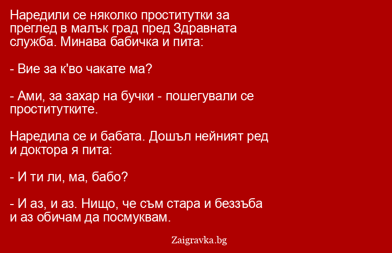 Наредили се няколко проститутки за преглед в малък град пред Здравната служба. Минава бабичка и пита: