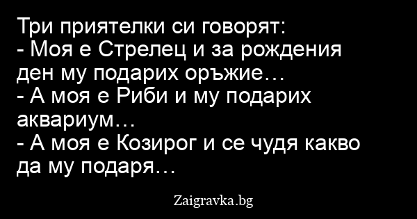 - А моя е Козирог и се чудя какво да му подаря…