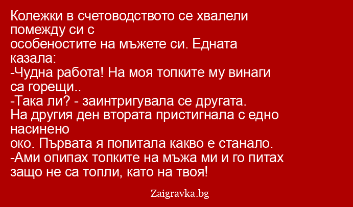 -Ами опипах топките на мъжа ми и го питах защо не са топли, като на твоя!