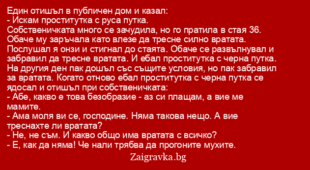 На другия ден пак дошъл със същите условия, но пак забравил за вратата. Когато отново ебал проститутка с черна путка се ядосал и отишъл при собственичката: