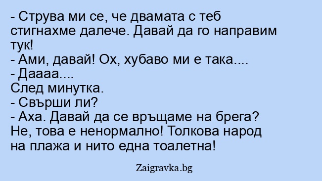 - Аха. Давай да се връщаме на брега? Не, това е ненормално! Толкова народ на плажа и нито една тоалетна!