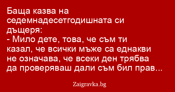 - Мило дете, това, че съм ти казал, че всички мъже са еднакви не означава, че всеки ден трябва да проверяваш дали съм бил прав...