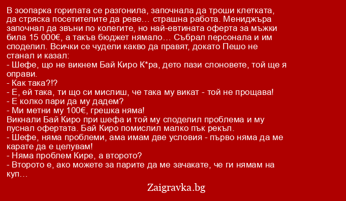 В зоопарка горилата се разгонила, започнала да троши клетката, да стряска посетителите да реве… страшна работа. Мениджъра започнал да звъни по колегите, но най-евтината оферта за мъжки била 15 000€, а такъв бюджет нямало… Събрал персонала и им споделил. Всички се чудели какво да правят, докато Пешо не станал и казал:
