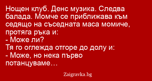 Нощен клуб. Денс музика. Следва балада. Момче се приближава към седящо на съседната маса момиче, протяга ръка и: