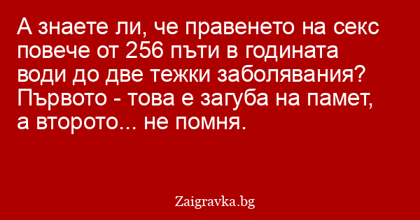 А знаете ли, че правенето на секс повече от 256 пъти в годината води до две тежки заболявания? Първото - това е загуба на памет, а второто... не помня.
