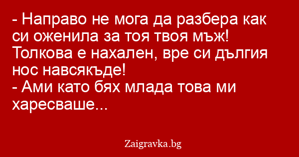 - Направо не мога да разбера как си оженила за тоя твоя мъж! Толкова е нахален, вре си дългия нос навсякъде!