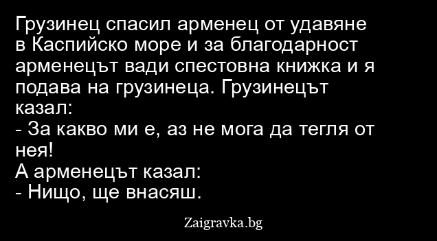Грузинец спасил арменец от удавяне в Каспийско море и за благодарност арменецът вади спестовна книжка и я подава на грузинеца. Грузинецът казал: