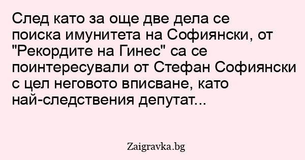 След като за още две дела се поиска имунитета на Софиянски, от "Рекордите на Гинес" са се поинтересували от Стефан Софиянски с цел неговото вписване, като най-следствения депутат...