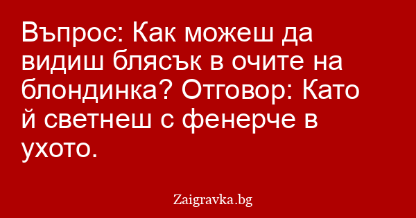 Въпрос: Как можеш да видиш блясък в очите на блондинка? Отговор: Като й светнеш с фенерче в ухото.
