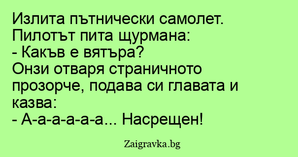 Фотограф от географско списание получил задача да направи снимки на голям горски пожар. Поради голямото количество дим, не било възможно да се направят добри снимки. Фотографът се обадил в редакцията и помолил да наемат самолет. Главният редактор му казал, че самолета ще го чака на близкото летище. На другата сутрин фотографа пристига на летището и вижда на пистата самолет, който форсира двигателите. С нетърпение да направи снимките скача в самолета и виква на пилота: