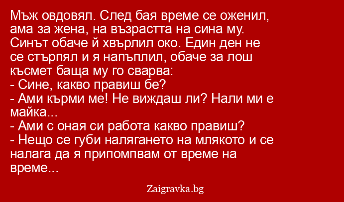 Мъж овдовял. След бая време се оженил, ама за жена, на възрастта на сина му. Синът обаче й хвърлил око. Един ден не се стърпял и я напъплил, обаче за лош късмет баща му го сварва: