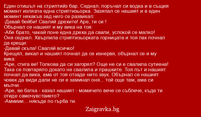 Оня седнал. Хвърлила стриптизьорката горницата и тоя пак почнал да крещи: