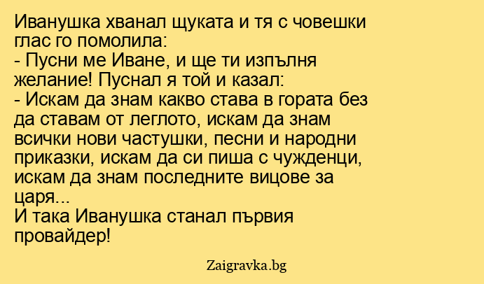 - Пусни ме Иване, и ще ти изпълня желание! Пуснал я той и казал: