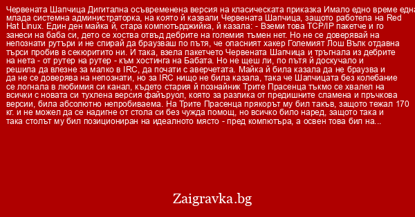 И така, взела пакетчето Червената Шапчица и тръгнала из дебрите на нета - от рутер на рутер - към хостинга на Бабата. Но не щеш ли, по пътя й доскучало и решила да влезне за малко в IRC, да почати с аверчетата. Майка й била казала да не браузва и да не се доверява на непознати, но за IRC нищо не била казала, така че Шапчицата без колебание се логнала в любимия си канал, където стария й познайник Трите Прасенца тъкмо се хвалел на всички с новата си тухлена версия файъруол, която за разлика от предишните сламена и пръчкова версии, била абсолютно непробиваема. На Трите Прасенца прякорът му бил такъв, защото тежал 170 кг. и не можел да се надигне от стола си без чужда помощ, но всичко било наред, защото така и така столът му бил позициониран на идеалното място - пред компютъра, а освен това бил на колелца, та можел лесно да се придвижва и до хладилника. Разговорът им протекъл горе-долу така: