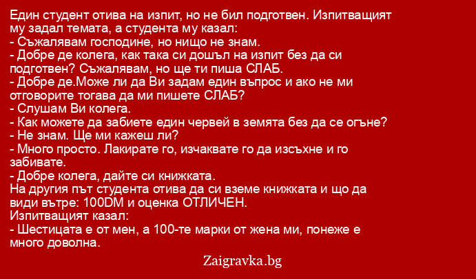На вратата като излизал успял да подшушне на следващия "кажи, че изпит се дава". Ситуацията се повторила с въпроса, но отговора бил, че изпит се дава. Отново верни отговори, но и на този студент изпитващия казал: "Няма да Ви дам изпита. Съжалявам. Двойка".