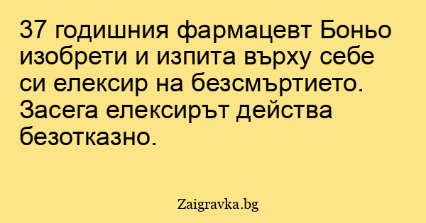37 годишния фармацевт Боньо изобрети и изпита върху себе си елексир на безсмъртието. Засега елексирът действа безотказно.