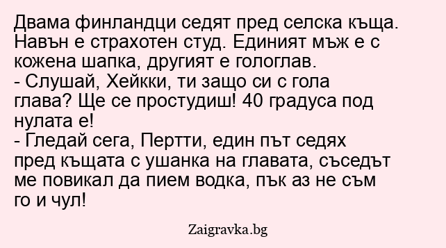 - Слушай, Хейкки, ти защо си с гола глава? Ще се простудиш! 40 градуса под нулата е!