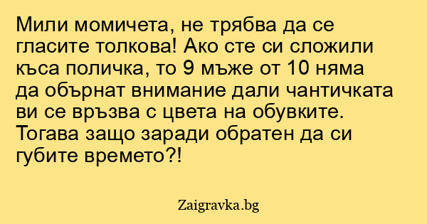 Мили момичета, не трябва да се гласите толкова! Ако сте си сложили къса поличка, то 9 мъже от 10 няма да обърнат внимание дали чантичката ви се връзва с цвета на обувките. Тогава защо заради обратен да си губите времето?!