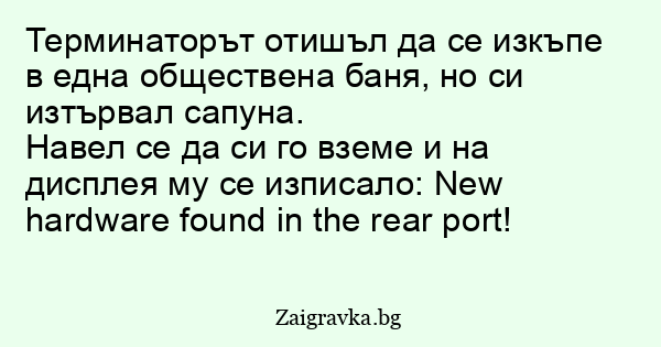 Терминаторът отишъл да се изкъпе в една обществена баня, но си изтървал сапуна.