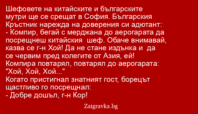 - Компир, бегай с мерджана до аерогарата да посрещнеш китайския шеф. Обаче внимавай, казва се г-н Хой! Да не стане издънка и да се червим пред колегите от Азия, ей!