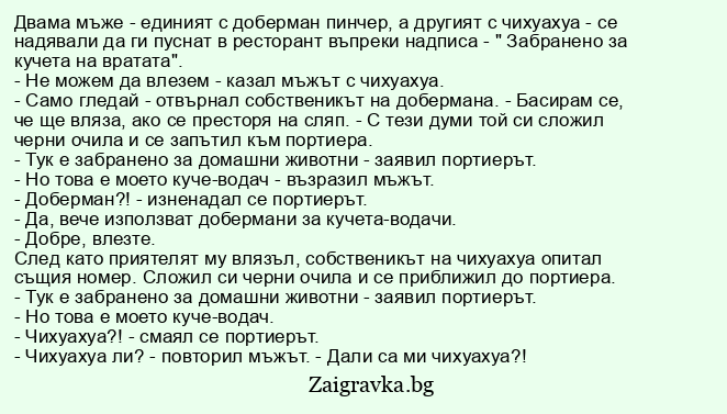 - Само гледай - отвърнал собственикът на добермана. - Басирам се, че ще вляза, ако се престоря на сляп. - С тези думи той си сложил черни очила и се запътил към портиера.