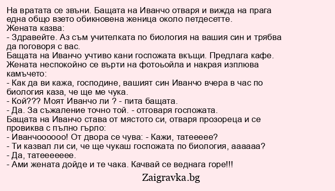 - Как да ви кажа, господине, вашият син Иванчо вчера в час по биология каза, че ще ме чука.