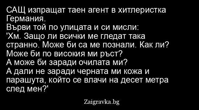 А дали не заради черната ми кожа и парашута, който се влачи на десет метра след мен?'