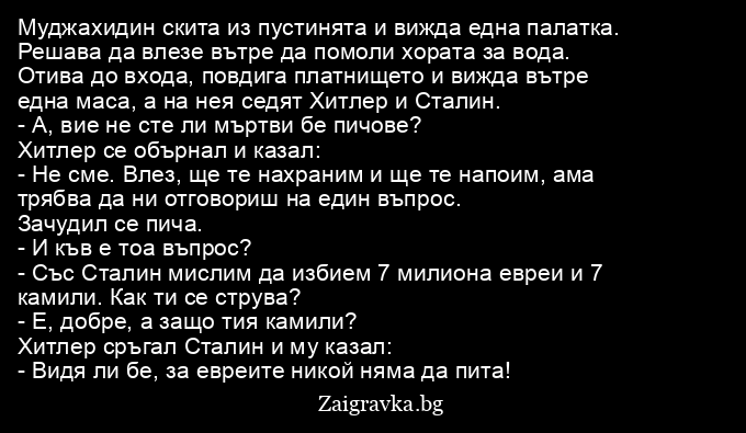 Муджахидин скита из пустинята и вижда една палатка. Решава да влезе вътре да помоли хората за вода. Отива до входа, повдига платнището и вижда вътре една маса, а на нея седят Хитлер и Сталин.