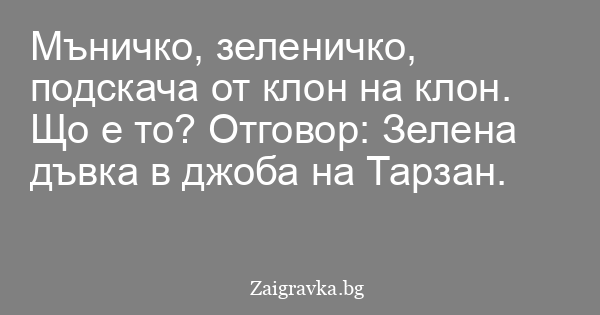 Мъничко, зеленичко, подскача от клон на клон. Що е то? Отговор: Зелена дъвка в джоба на Тарзан.