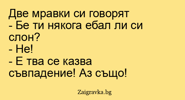 Вървели си мравката и слона заедно, и по едно време слонът стъпил върху нея. Веднага почнал да й се извинява: