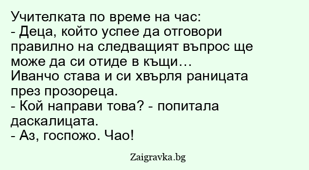 - Деца, който успее да отговори правилно на следващият въпрос ще може да си отиде в къщи…