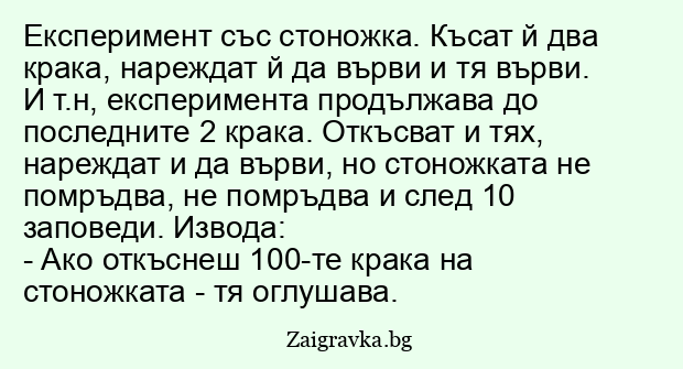 Експеримент със стоножка. Късат й два крака, нареждат й да върви и тя върви. И т.н, експеримента продължава до последните 2 крака. Откъсват и тях, нареждат и да върви, но стоножката не помръдва, не помръдва и след 10 заповеди. Извода: