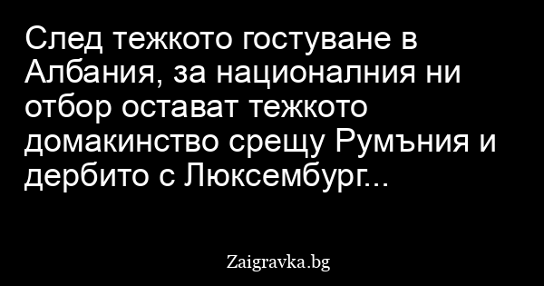 След тежкото гостуване в Албания, за националния ни отбор остават тежкото домакинство срещу Румъния и дербито с Люксембург...