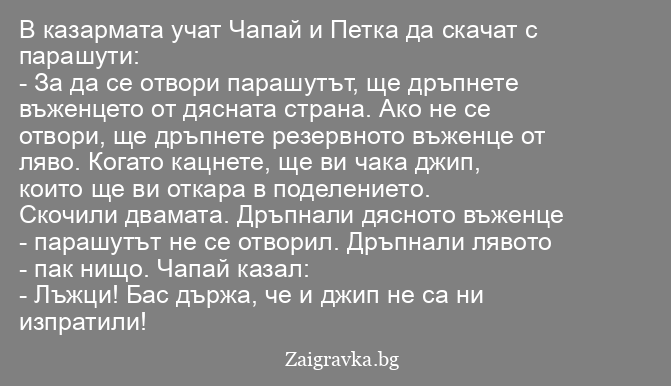 Скочили двамата. Дръпнали дясното въженце - парашутът не се отворил. Дръпнали лявото - пак нищо. Чапай казал: