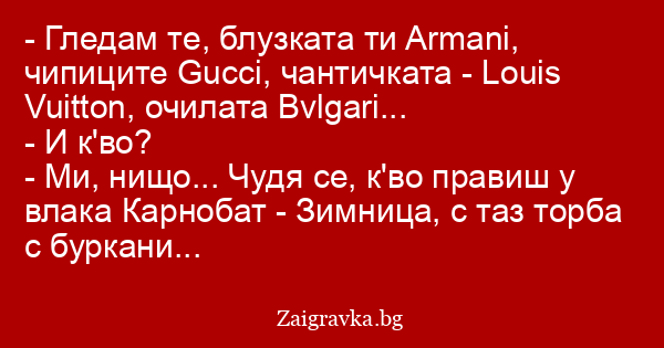 - Гледам те, блузката ти Armani, чипиците Gucci, чантичката - Louis Vuitton, очилата Bvlgari...