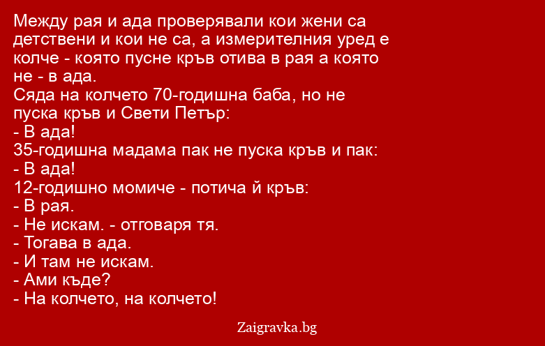 Между рая и ада проверявали кои жени са детствени и кои не са, а измерителния уред е колче - която пусне кръв отива в рая а която не - в ада.