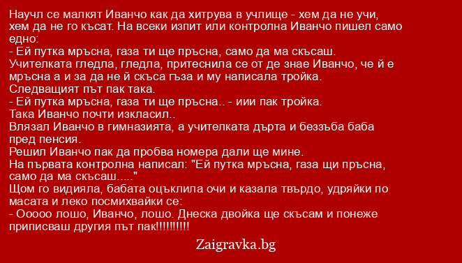 - Ооооо лошо, Иванчо, лошо. Днеска двойка ще скъсам и понеже приписваш другия път пак!!!!!!!!!!
