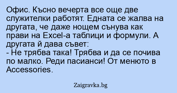Офис. Късно вечерта все още две служителки работят. Едната се жалва на другата, че даже нощем сънува как прави на Excel-a таблици и формули. А другата й дава съвет: