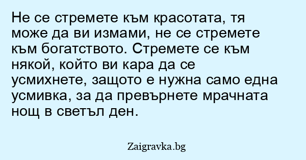 Не се стремете към красотата, тя може да ви измами, не се стремете към богатството. Стремете се към някой, който ви кара да се усмихнете, защото е нужна само една усмивка, за да превърнете мрачната нощ в светъл ден.