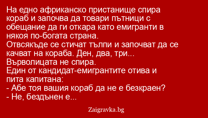 На едно африканско пристанище спира кораб и започва да товари пътници с обещание да ги откара като емигранти в някоя по-богата страна.