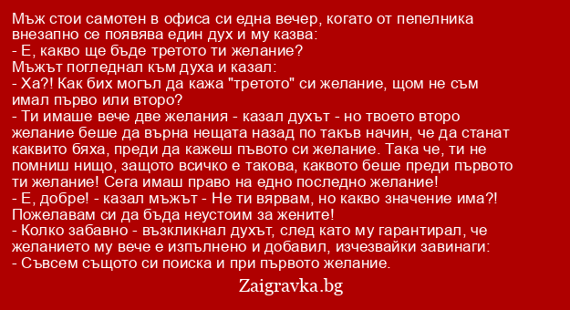 - Ти имаше вече две желания - казал духът - но твоето второ желание беше да върна нещата назад по такъв начин, че да станат каквито бяха, преди да кажеш пъвото си желание. Така че, ти не помниш нищо, защото всичко е такова, каквото беше преди първото ти желание! Сега имаш право на едно последно желание!