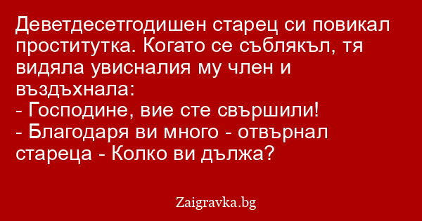 Деветдесетгодишен старец си повикал проститутка. Когато се съблякъл, тя видяла увисналия му член и въздъхнала: