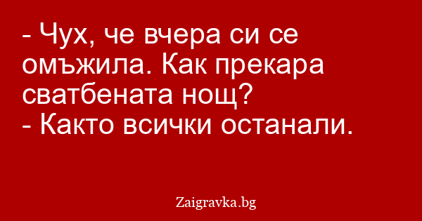 - Чух, че вчера си се омъжила. Как прекара сватбената нощ?