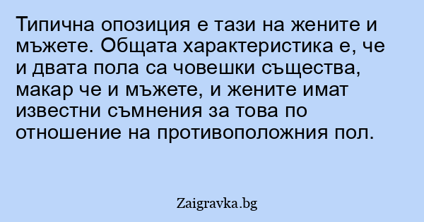Типична опозиция е тази на жените и мъжете. Общата характеристика е, че и двата пола са човешки същества, макар че и мъжете, и жените имат известни съмнения за това по отношение на противоположния пол.