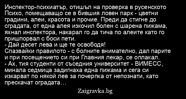 Инспектор-психиатър, отишъл на проверка в русенското Психо, помещаващо се в бившия ловен парк - цветни градини, алеи, красота и прочие. Преди да стигне до сградата, от една алея изкочил болен с шарена пижама, яхнал инспектора, накарал го да тича по алеите като го пришпорвал с боси пети.